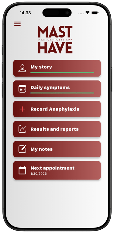 In addition to the daily activity score (MAS), every 4 weeks you have the opportunity to answer questions about disease control (Mastocytosis Control Test - MCT) and quality of life (Mastocytosis Quality of Life - MCQoL).