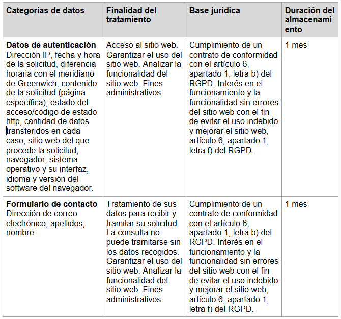 A continuación le mostramos qué categorías de datos se recogen, la finalidad del tratamiento, la base jurídica aplicable y la duración del almacenamiento.