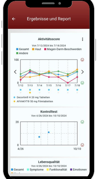 Die von Ihnen sorgfältig eingegebenen Daten werden hier grafisch aufbereitet. So können Sie den Verlauf Ihrer Erkrankung leicht verfolgen und Veränderungen der Krankheitsaktivität, z.B. durch eine Änderung der Medikation oder des Lebensstils, erkennen.