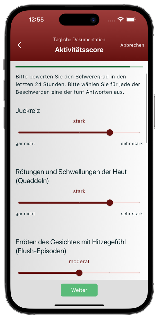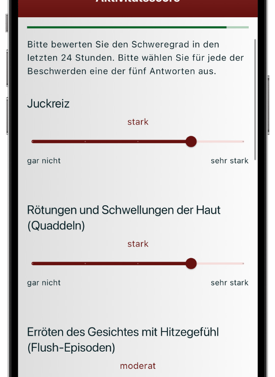 Dieser Bereich hilft Ihnen, Ihre Beschwerden der letzten 24 Stunden (bekannt als Mastozytose-Aktivitäts-Score - MAS) sowie Informationen über mögliche anaphylaktische Reaktionen und eingenommene Medikamente zu erfassen. Diese tägliche Dokumentation hilft, Muster zu erkennen und die Behandlung entsprechend anzupassen.